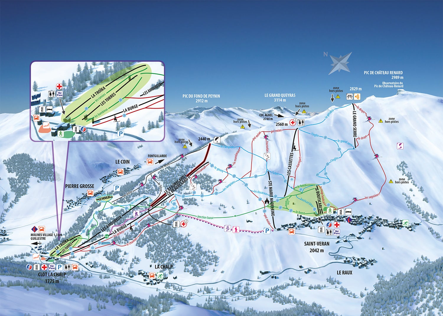 Molines en Queyras Plano de pistasConsulta las pistas y remontes de Molines en Queyras con nuestro mapa interactivo de la estación. Planifica tu jornada antes de ir o navega por la montaña mientras estás allí con los mapas de pistas más recientes de Molines en Queyras.Haz clic para ampliar el mapa de pistas