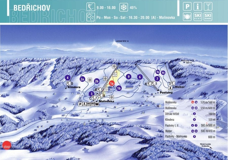 Bedrichov Plano de pistasConsulta las pistas y remontes de Bedrichov con nuestro mapa interactivo de la estación. Planifica tu jornada antes de ir o navega por la montaña mientras estás allí con los mapas de pistas más recientes de Bedrichov.Haz clic para ampliar el mapa de pistas