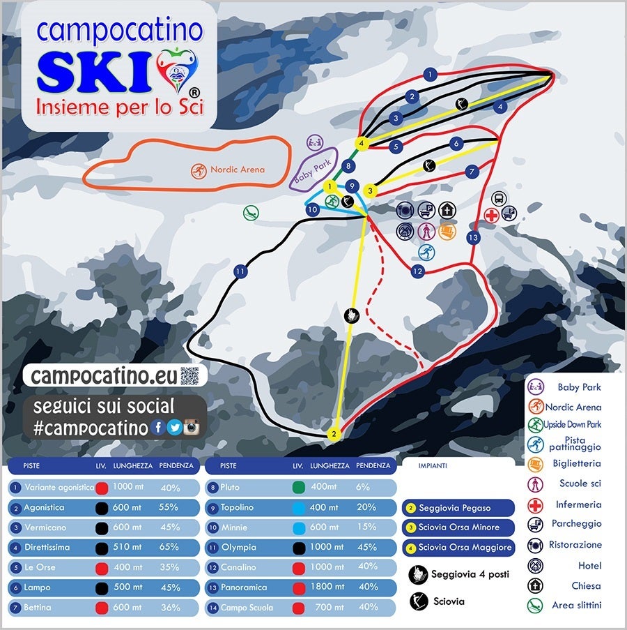 Campocatino Plano de pistasConsulta las pistas y remontes de Campocatino con nuestro mapa interactivo de la estación. Planifica tu jornada antes de ir o navega por la montaña mientras estás allí con los mapas de pistas más recientes de Campocatino.Haz clic para ampliar el mapa de pistas