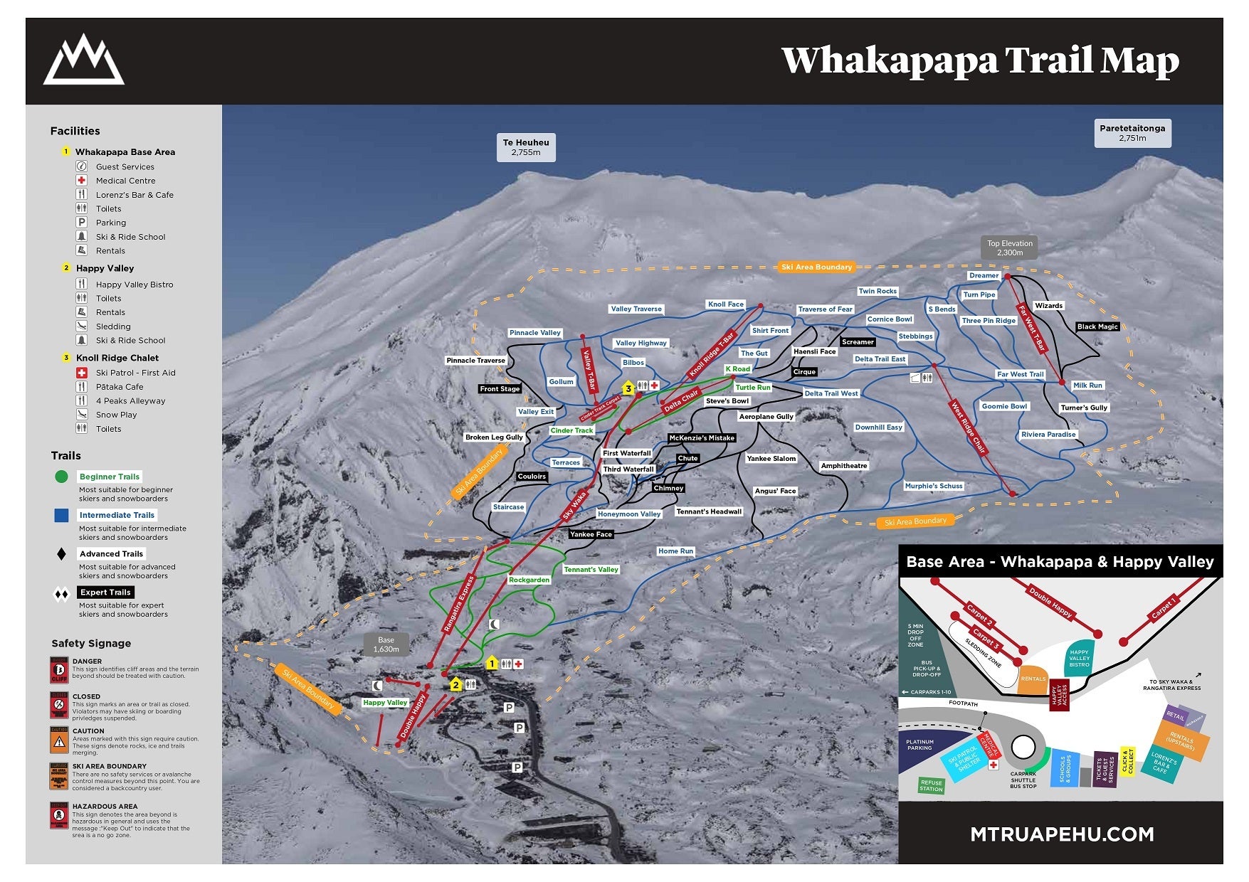 El terreno de Whakapapa está dividido naturalmente por antiguas coladas de lava, creando un espectacular parque alpino de 550 hectáreas. La zona esquiable incluye 31 pistas con un desnivel de 670 metros y una pista más larga de 4 km. El complejo cuenta con 8 remontes, incluyendo la telecabina Sky Waka, telesillas rápidos de cuatro plazas, telesillas dobles y remontes de superficie. El trazado es intuitivo, con zonas de progresión bien definidas y amplias cuencas que se adaptan a todos los niveles.