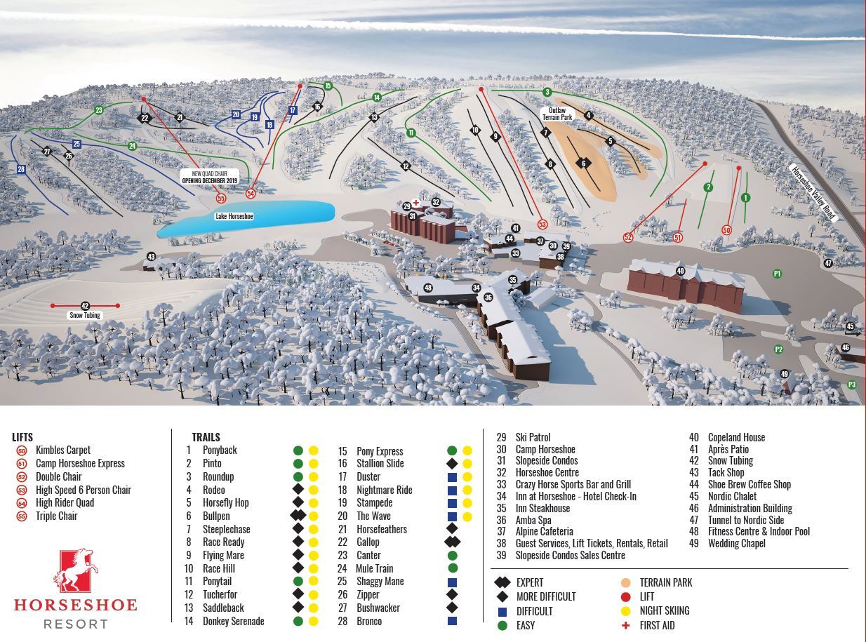 Horseshoe Resort Plano de pistasConsulta las pistas y remontes de Horseshoe Resort con nuestro mapa interactivo de la estación. Planifica tu jornada antes de ir o navega por la montaña mientras estás allí con los mapas de pistas más recientes de Horseshoe Resort.Haz clic para ampliar el mapa de pistas