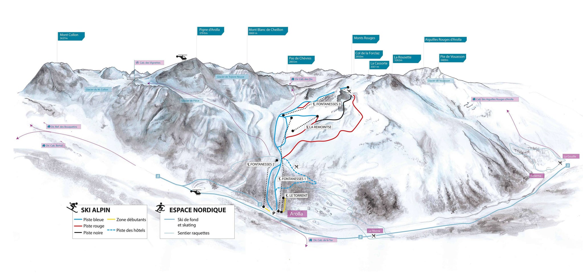 Arolla Plano de pistasConsulta las pistas y remontes de Arolla con nuestro mapa interactivo de la estación. Planifica tu jornada antes de ir o navega por la montaña mientras estás allí con los mapas de pistas más recientes de Arolla.Haz clic para ampliar el mapa de pistas
